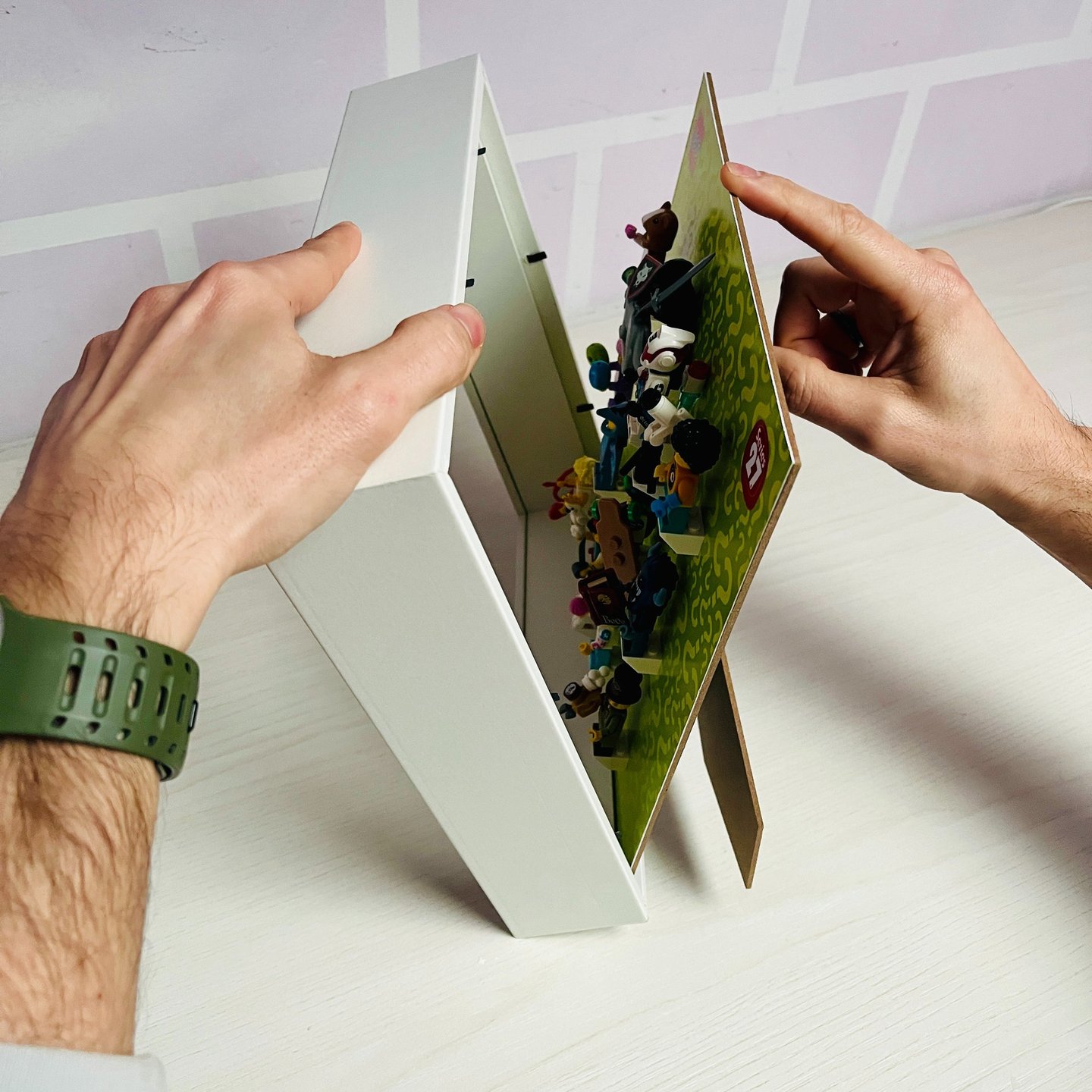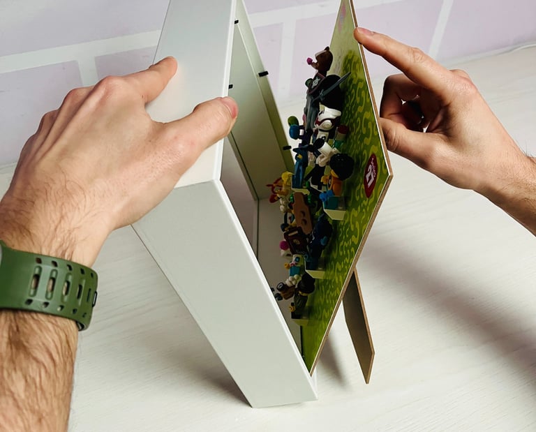 Una volta posizionate tutte le minifigures, posizionarsi con la base e la cornice verticalmente e procedere alla chiusura verificando che non ci siano impedimenti tra le minifigures e gli accessori montati.